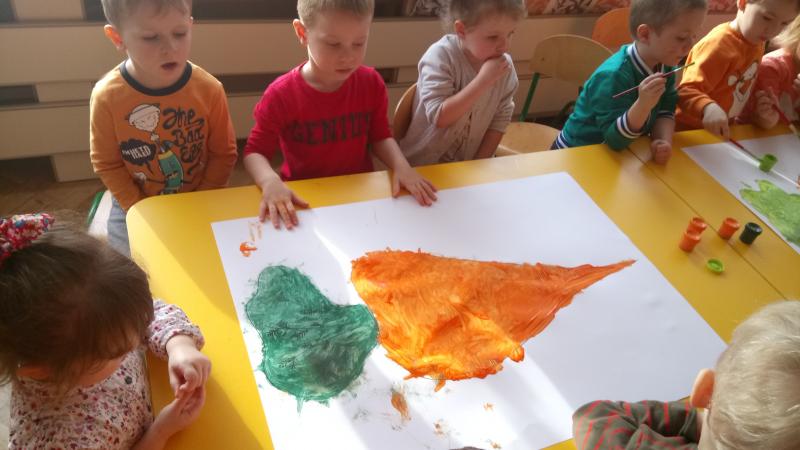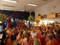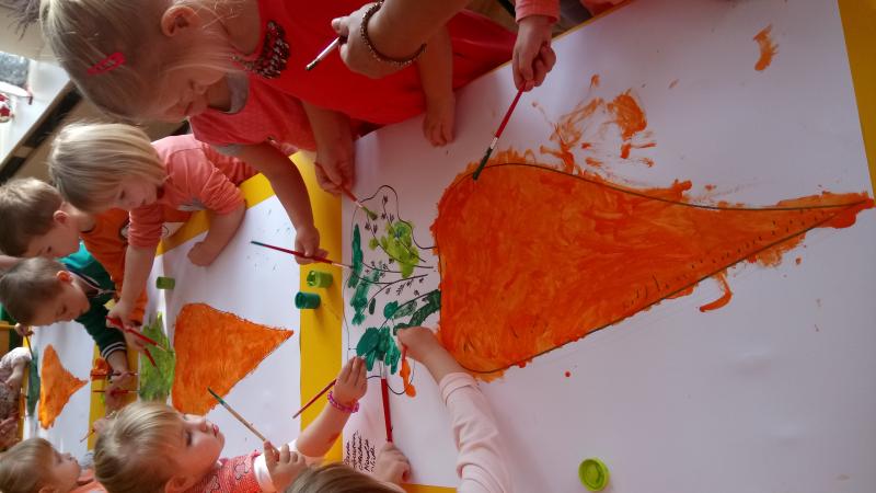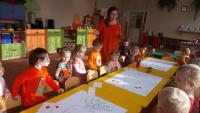 Za oknem było szaro i mokro, ale za to w przedszkolu dominującym kolorem był ulubiony kolor pani Jesieni- pomarańczowy. A to za przyczyną pani z grupy V E. Jul, która w dniu 24 listopada zorganizowała uroczystość wraz z dziećmi pt "Pożegnanie jesieni" połączony z pomarańczowym dniem. Tego dnia wszyscy pracownicy Przedszkola Nr 4 oraz przedszkolaki przyszli ubrani na pomarańczowo. Posiłki tego dnia były również koloru pomarańczowego. Z okazji tak ważnego dnia przygotowano dla dzieci wiele atrakcji. Nauczycielka przedstawiła montaż słowno-muzyczny oraz inscenizację pt "O gąsiareczce Kasieni i o cudownych listkach Pani Jesieni . Po inscenizacji dzieci przeniosły się do królestwa Pani Jesieni . Wszystkie grupy w swoich salach wykonywały zadania, które pani Jesień zostawiła im w listach rozwiązywały zagadki oraz wykonywały różne prace plastyczne. W tym dniu Jesień zakończyła swoje panowanie i ustąpiła miejsca zimie.